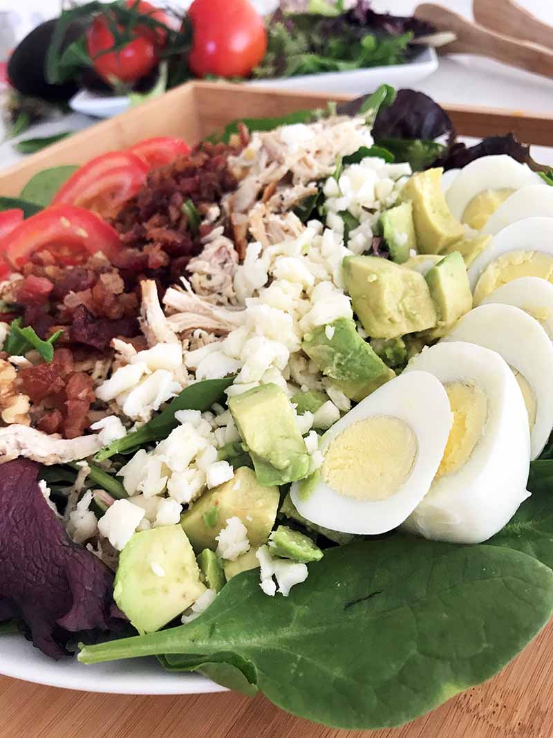 - Place tomatoes, avocado, egg, chicken, feta, and bacon in horizontal rows on top of the mixed greens.